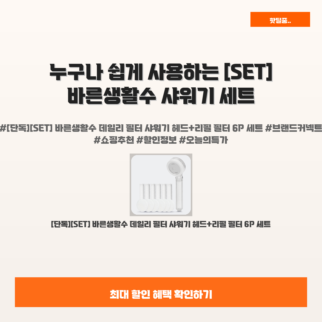 🛍️ 이 포스팅은 네이버 쇼핑 커넥트 활동의 일환으로,판매 발생 시 수수료를 제공받습니다.오늘 소개할 제품은 단언컨데,,그야말로 완벽한, 갓벽한, 감동적인 제품이라구요요즘 같은 시대에 안전하고 깨끗한 물은 필수잖아요? 하지만 샤워기 필터는 자주 바꿔야 해서 귀찮고 비용도 만만치 않죠. 그러던 중에 발견한 "[단독][SET] 바른생활수 데일리 필터 샤워기 헤드+리필 필터 6P 세트"는 그런 고민을 한 번에 해결해줄 제품이에요!이 제품은 제가 믿고 추천하는 이유가 너무 많아요. 사용하기도 쉽게 설계되어 있어서 누구나 간편하게 필터 교체가 가능해요. 진짜 효율성과 가성비 모두 잡았다구요! 여러분들도 이 행복감 꼭 느껴보세요!그리고 진짜 사도 후회 안 해요... 가격도 할인된 30,800원으로 제공되고 있으니..