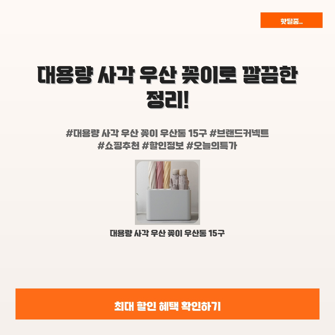 🛍️ 이 포스팅은 네이버 쇼핑 커넥트 활동의 일환으로,판매 발생 시 수수료를 제공받습니다.오늘 소개할 제품은 단언컨데,,그야말로 깔끔한 정리의 대명사인 대용량 사각 우산 꽂이 우산통 15구입니다!요즘 비가 자주 오고 우산이 늘어가면서, 어디다 정리해야 할지 고민이 되시죠?그런 여러분을 위해 이 대용량 사각 우산 꽂이 우산통 15구가 등장했어요!이제는 복잡하게 얽힌 우산들 때문에 스트레스 받을 필요 없답니다. 정리된 공간에서 편안함을 느껴보세요. 이 제품은 우산 관리의 새로운 기준입니다.가격도 정말 합리적이어서 구매 후회는 절대 없을 거예요. 지금 바로 대용량 사각 우산 꽂이 우산통 15구의 매력을 느껴보세요!※ 이거 진짜 제가 직접 써보고 쓰는 리뷰예요 광고 아님!!대용량 사각 우산 꽂이 우산통 15구..